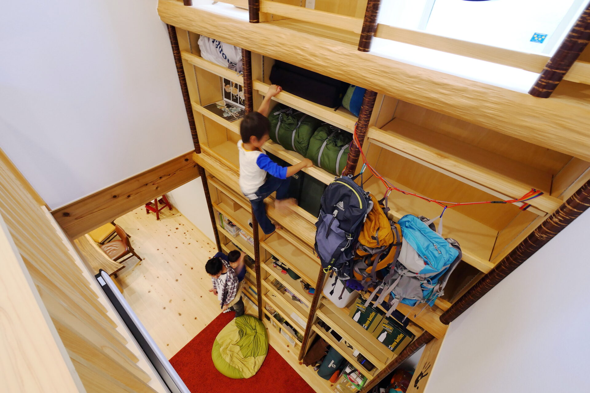 家の中でクライミング収納スペースと子供たちの遊び場を両立した住まい 吹き抜け部分に棚を作ることで収納スペースも大量に確保でき、子供たちの遊び場にもなりました。男心をくすぐられる遊び心のある住まいです。