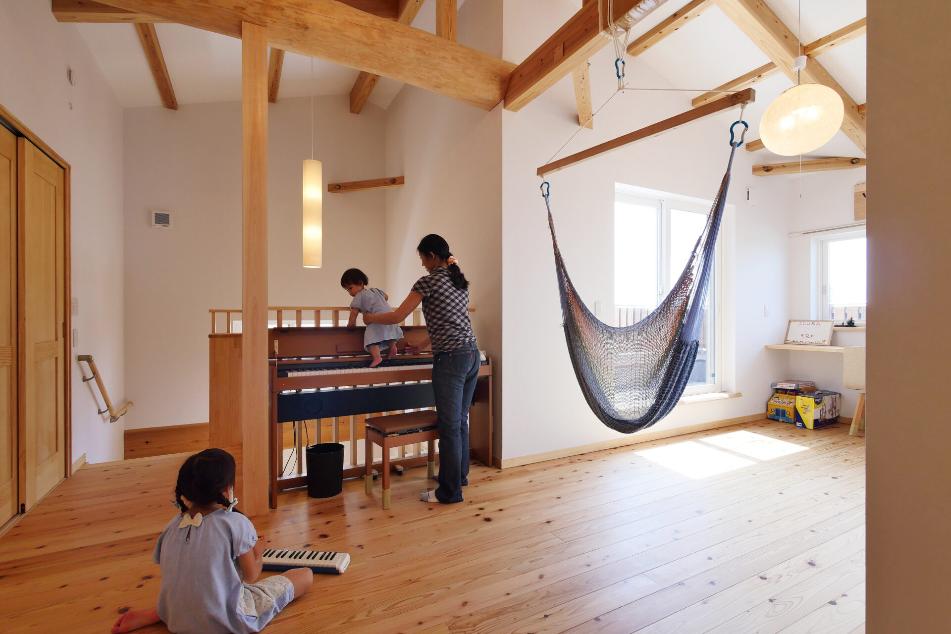 勾配天井を利用した開放的な空間にハンモックを採用 休みの日はハンモックに揺られながら、心地の良い時間を過ごすことができます。