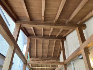 今回は屋根にガルバリウムの施工と天井に杉の羽目板、柱や梁なども化粧の杉で施工しております。