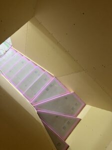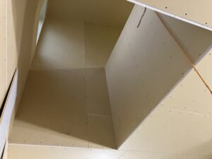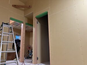 内部の工事で特に変化がみられるのは、壁となる「ボード施工」が終盤に差し掛かる工程です。