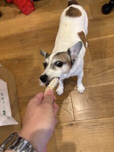 おやつをもらったり新しいおもちゃがあると咥えながらみんなのところを歩きまわります。