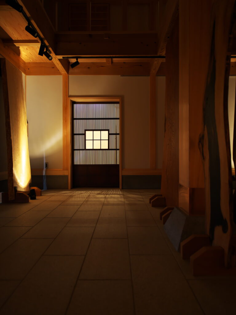 回廊の4隅には、大正時代の照明を再生して設えました。