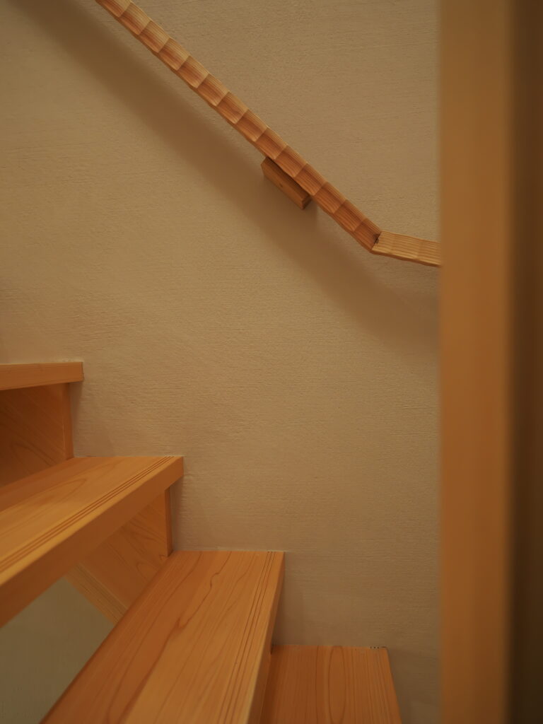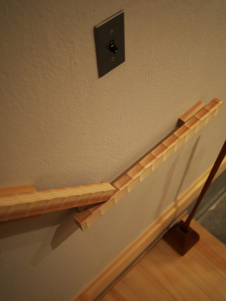 桧の階段と、吉野杉のなぐり加工の手すり。